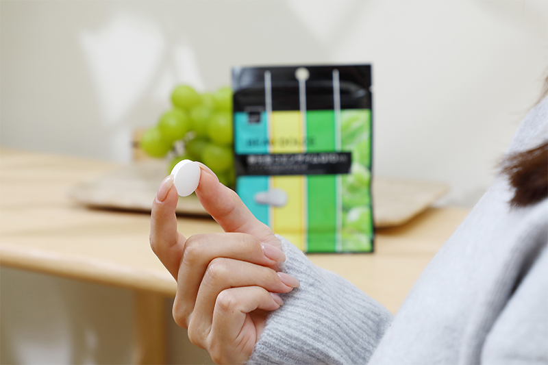 こちらは袋を開けた瞬間にシャインマスカットの芳醇な香りが漂います! 口に入れるとシャインマスカットならではのさわやかな香りと甘みがバランスよく感じられ、上品な味わいが楽しめます。瀬戸内産レモンよりデザート感が強く感じられるので、ちょっと疲れて甘いものが食べたい! なんてときにも満足できる、贅沢感とおいしさです。タブレットタイプなのでゆっくり口の中で溶かして食べることで、1粒食べ終わるのに10分ほど(個人差はありますが)かかりますし、美容サポート成分が配合されていることで気分も上がります。甘いもの欲に負けておやつを食べすぎてしまいがちな人や、甘いおやつに罪悪感を感じてしまう人でも食べやすい“美容おやつ”だと思いました。