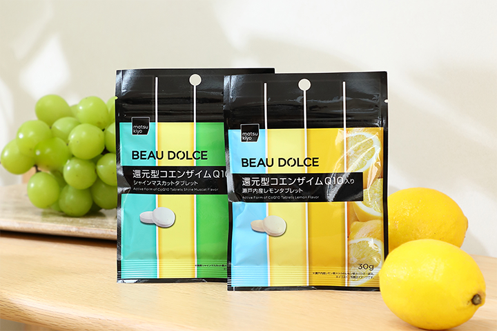 「還元型コエンザイムQ10入りタブレット」はデザートサプリ感覚で食べられる、食べながらキレイを意識できるおやつの最新版。これまでの「matsukiyo BEAU DOLCE(マツキヨ ボウドルチェ)」にはなかった、新しい美容サポート成分と形状なので、ボウドルチェファンのかたはもちろん、そうでないかたにも、ぜひお試しいただけるとうれしいです。