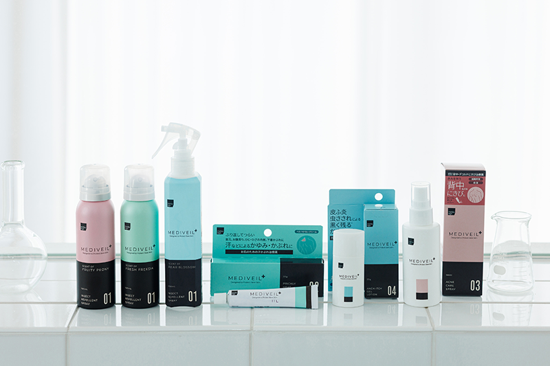 「matsukiyo メディヴェール(MEDIVEIL+)」は日常的に使いやすい処方とデザインにこだわった、肌に寄り添うアイテムを展開する新シリーズです。デビューアイテムは虫よけ剤からかゆみ止め、背中ニキビケア、汗かぶれケアなど幅広いラインアップでお届けします。数多くの美容商品を開発してきた「matsukiyo」だからこそ、使い続けたくなる心地よさを重視し、香りや処方、デザインにもこだわりました。