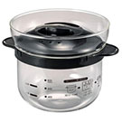 耐熱ガラス、PP 約幅19.5×奥行16.2×高さ14cm 約435g 付属品:計量カップ 1〜2合のご飯が炊ける、電子レンジ用のご飯釜。季節の炊き込みご飯も簡単調理。お米を水に浸し、電子レンジ10分で炊き上がります。 日本製