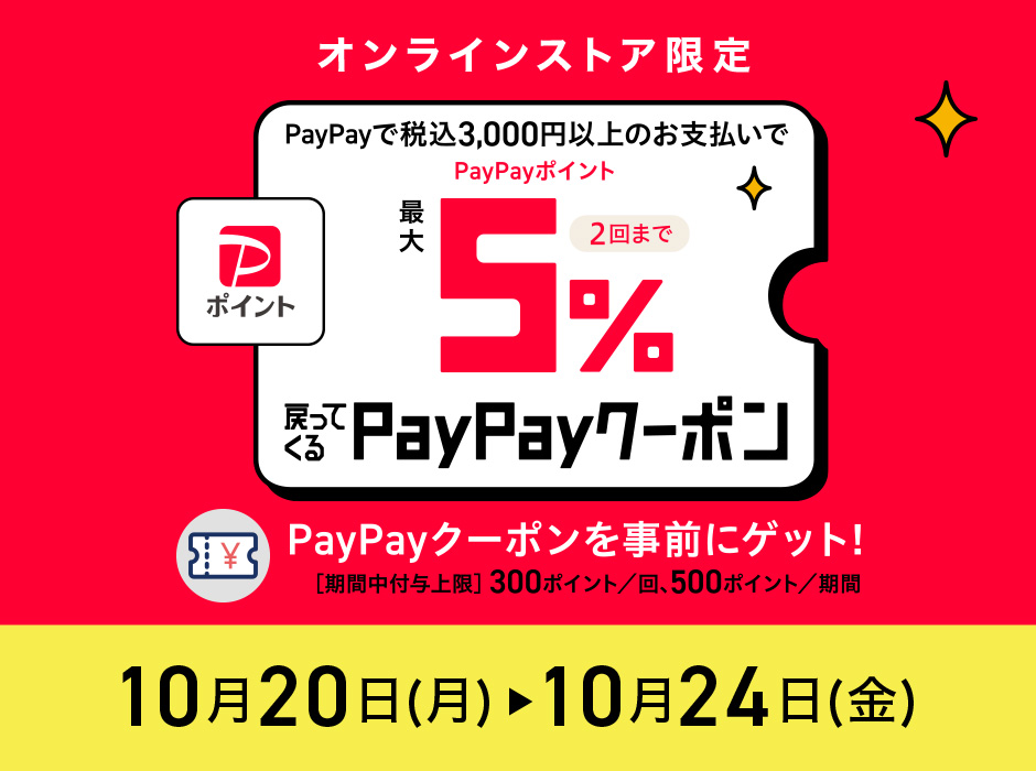 下記ボタンよりクーポンを取得し、PayPayで税込3,000円以上お支払いするともれなくPayPayポイントが最大で5%戻ってくる!