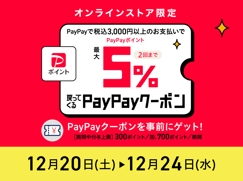 ※当サイトでのPayPay決済金額が3,000円以上の方が対象となります。期間中2回までご利用いただけます。