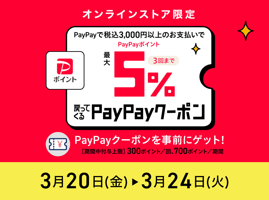 ※当サイトでのPayPay決済金額が3,000円以上の方が対象となります。期間中3回までご利用いただけます。