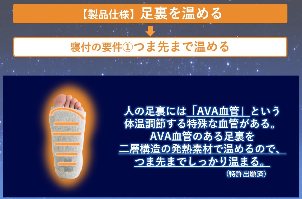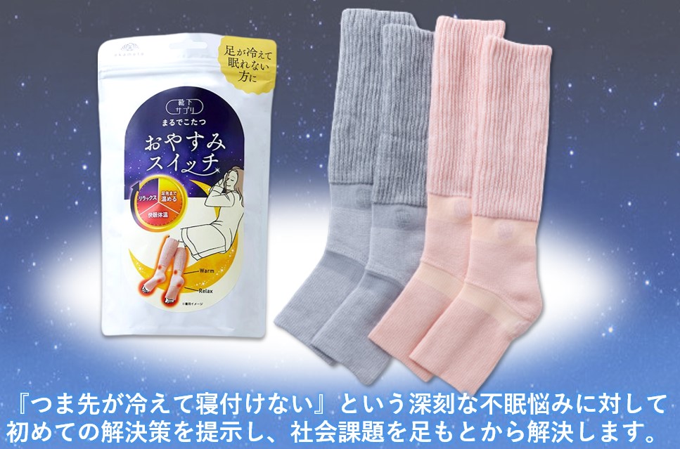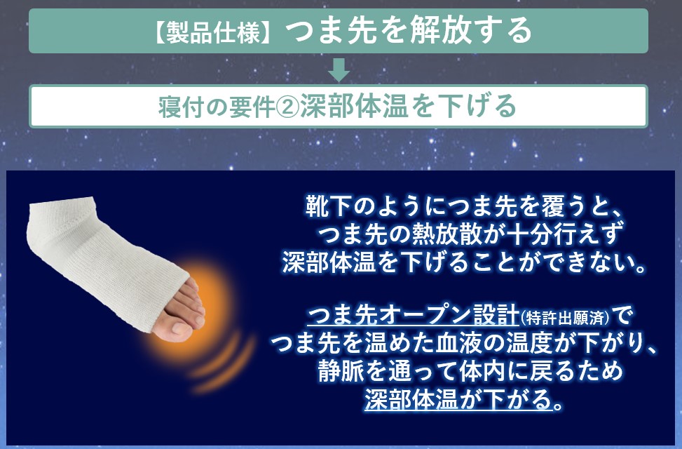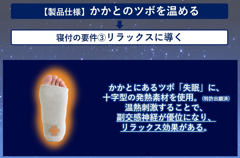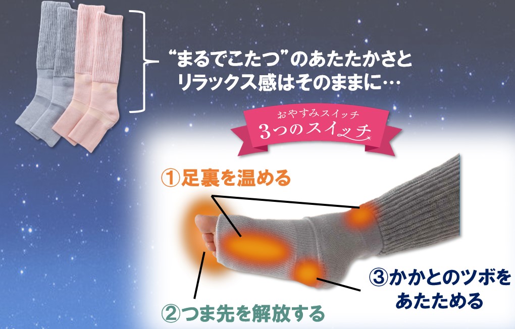 特許技術で足元からカラダを温める「まるでこたつ」シリーズのおやすみ用。足が冷えて眠れない、寝なきゃと焦ると不安という悩みに、眠りための3つのスイッチで、足先までポカポカ、まるでこたつみたいな温かさに包まれます。 【就寝時の冷え対策に】血管の集中する足裏をしっかり覆って足先まで温めます。足先オープンタイプなので、就寝時にも足先が蒸れることなく快適にお使いいただけます。