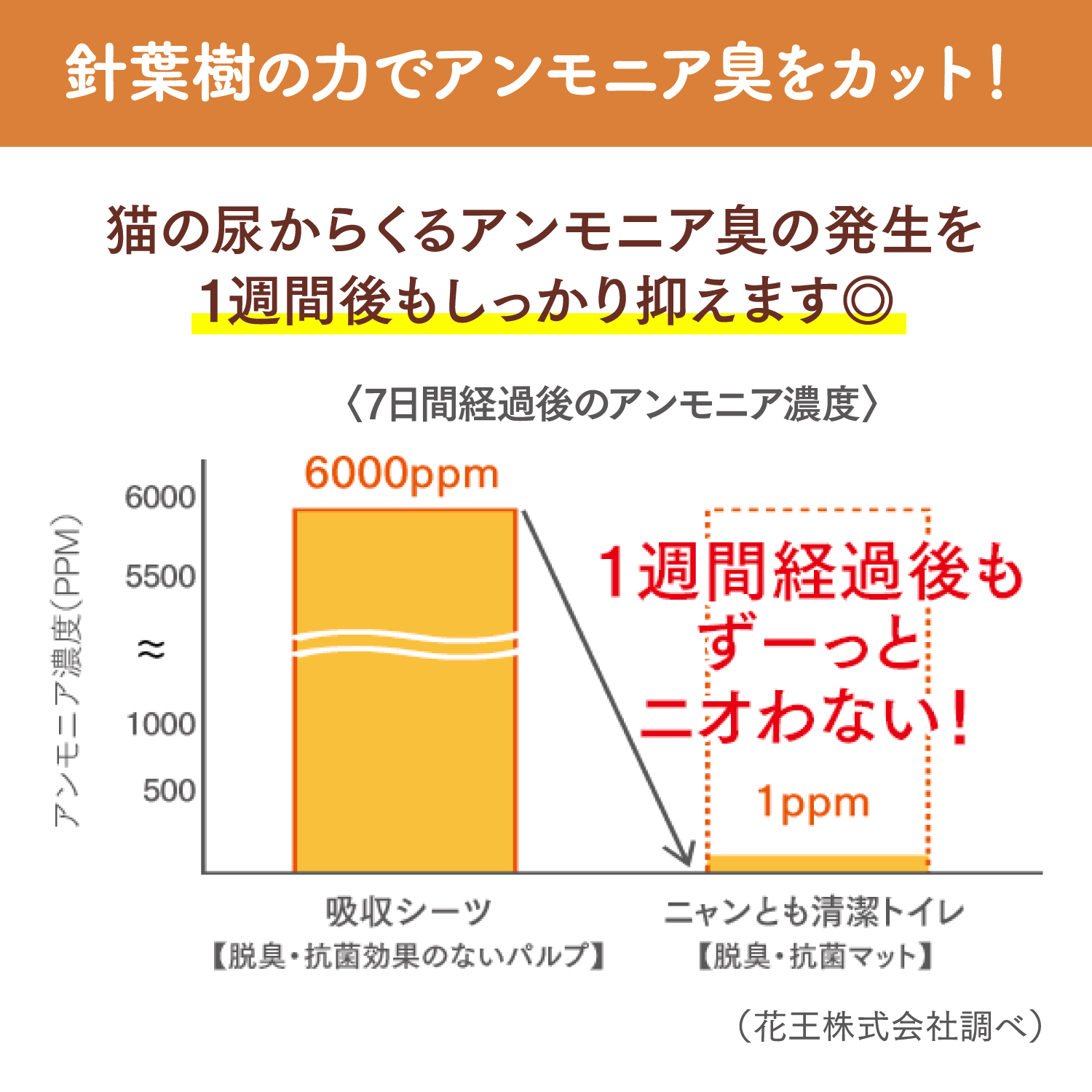 針葉樹のチカラで脱臭・抗菌。尿量が多くても、1週間分の尿とニオイをたっぷり吸収します。