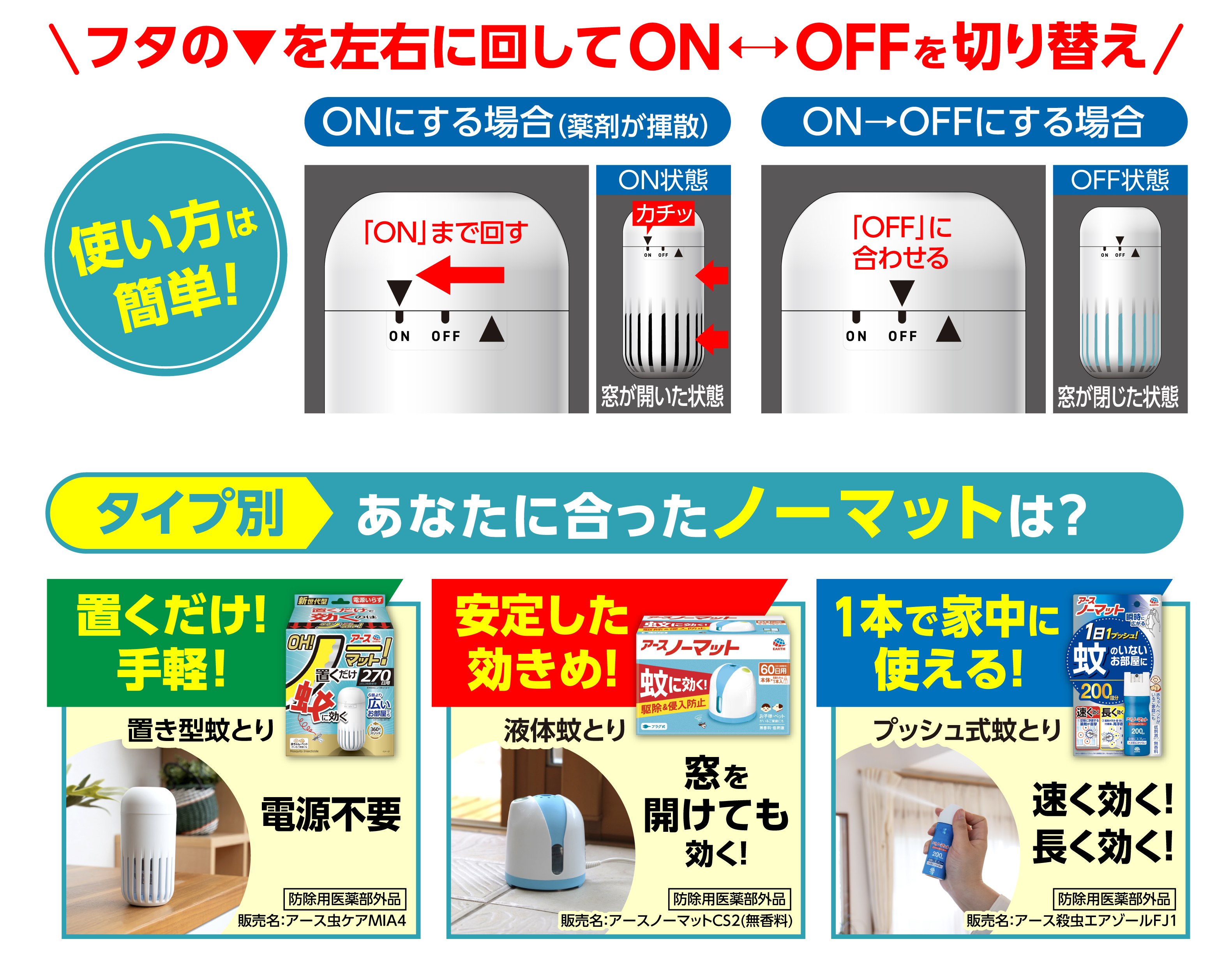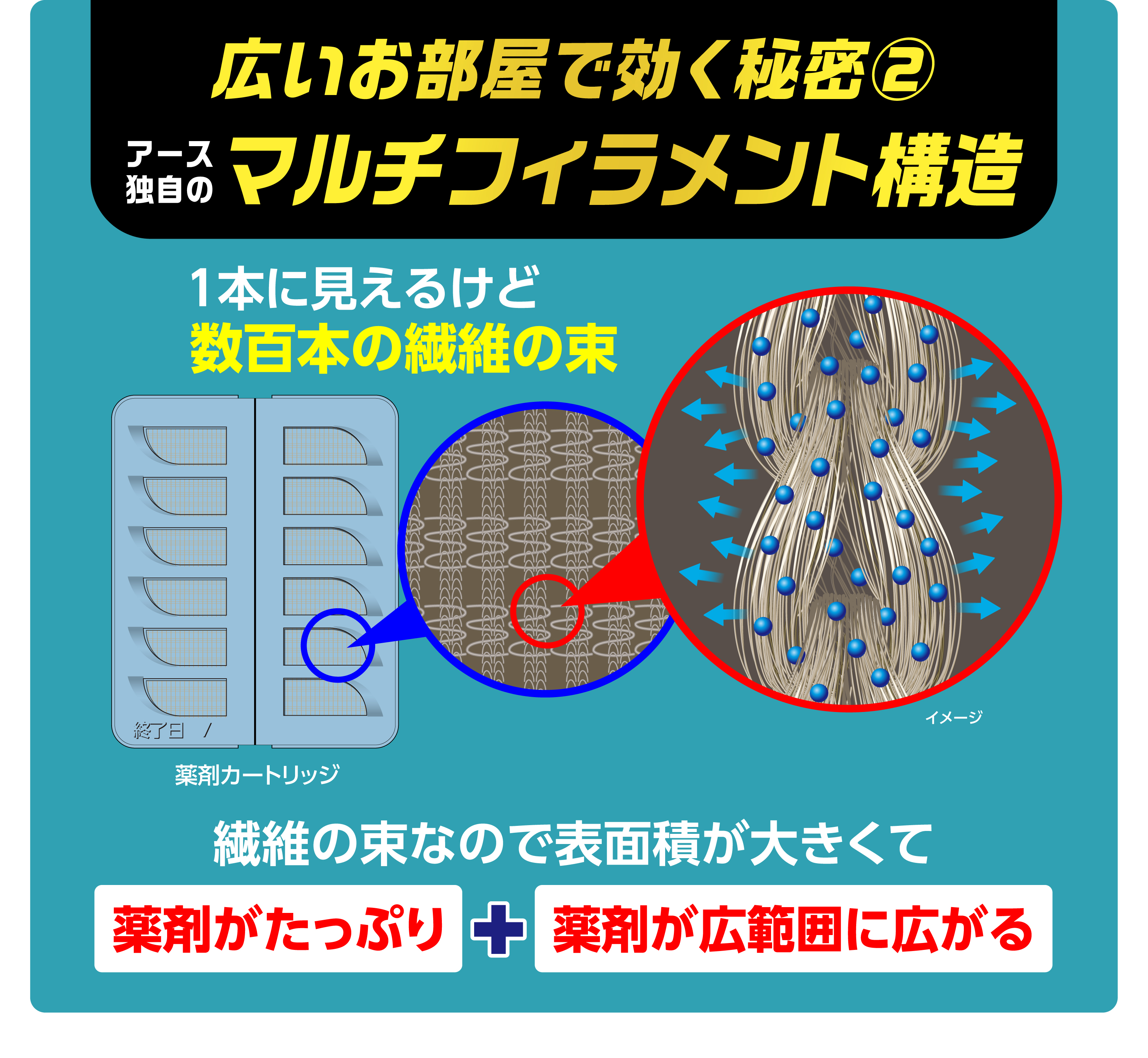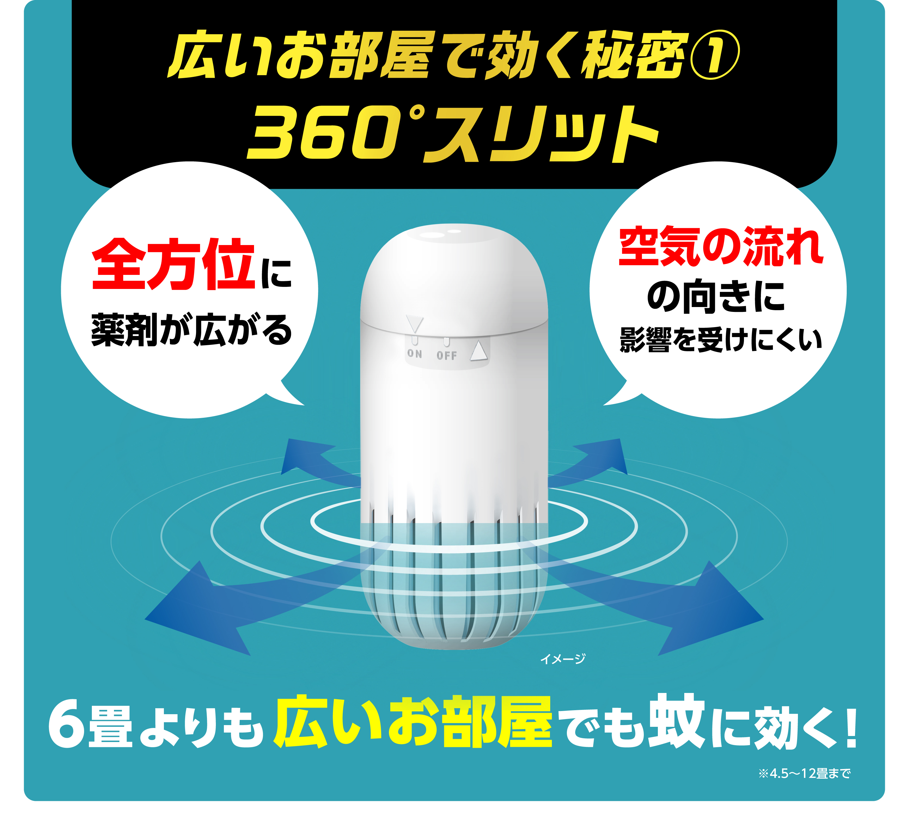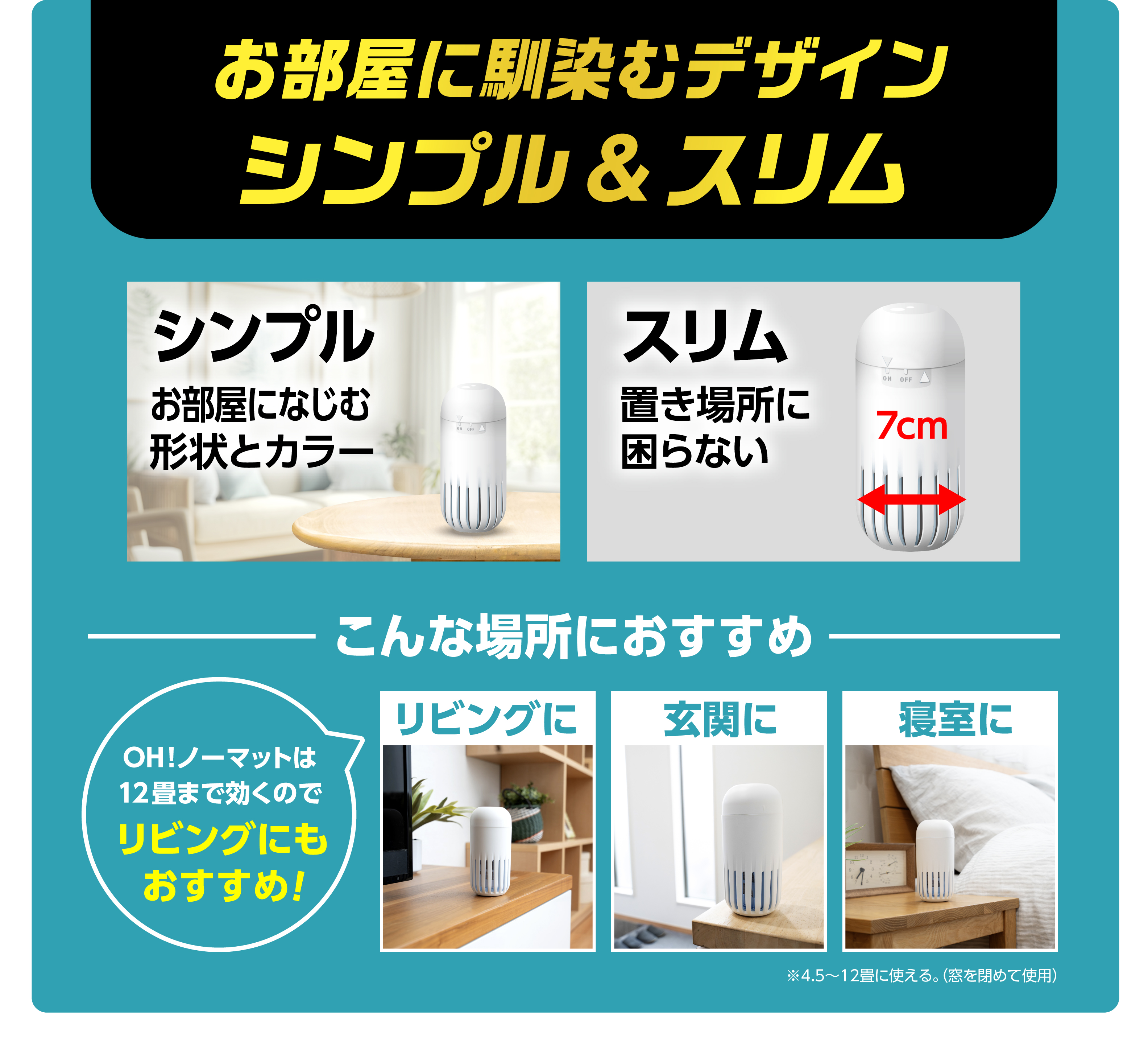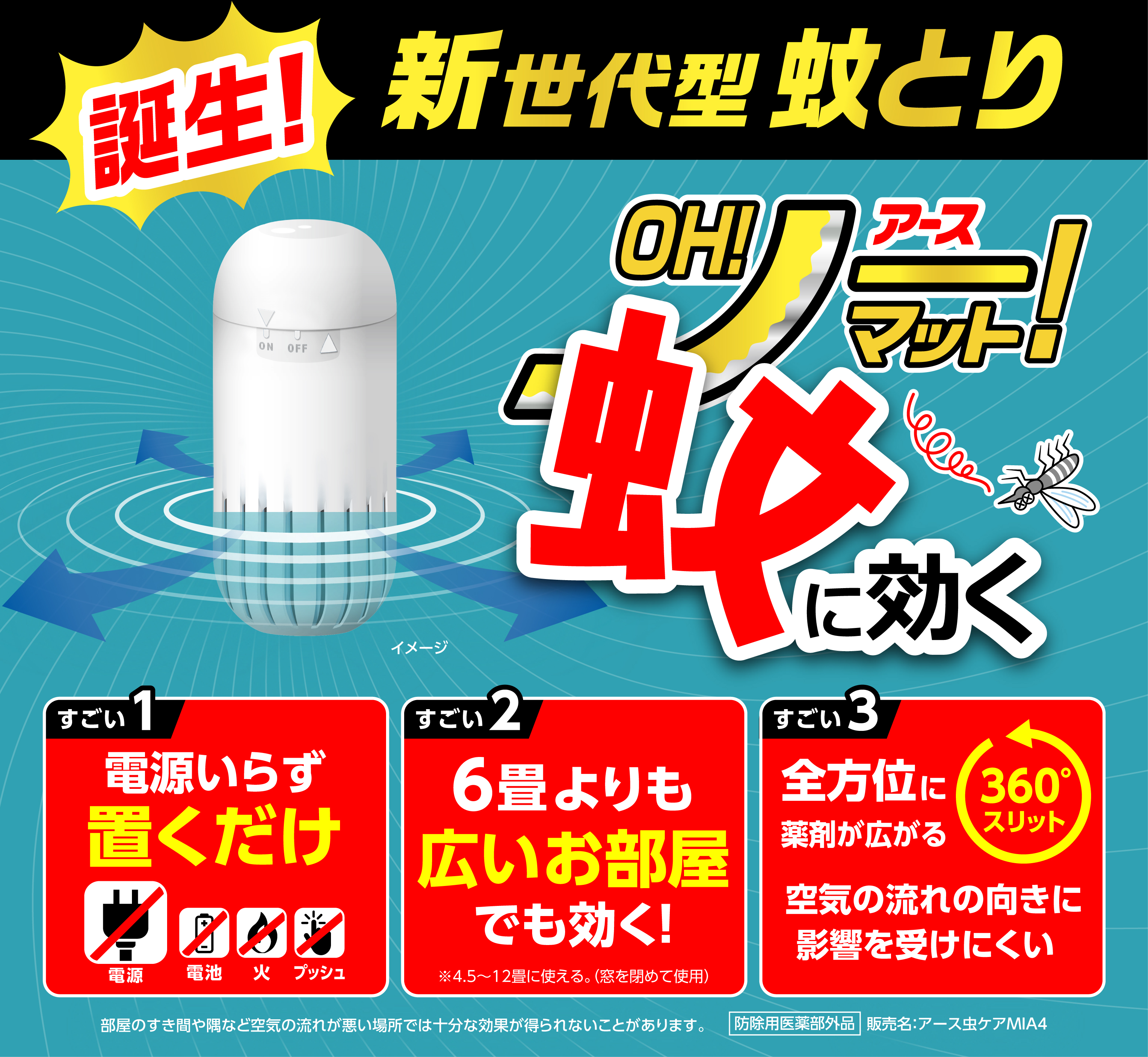 ●置くだけで蚊に効くのはOH!ノーマット! ●電源不要・電池不要・火不要・プッシュ不要 ●6畳より広いお部屋(※4.5畳から12畳まで)でも蚊に効く360度スリット ・空気の流れの向きに影響を受けにくい ・全方位に薬剤が広がる ※部屋のすき間や隅など空気の流れが悪い場所では十分な効果が得られないことがあります。 【アース独自のマルチフィラメント構造!】 ・1本に見える繊維は実は数百本の繊維の束 ・繊維の束なので表面積が大きくて「薬剤がたっぷり」+「薬剤が広範囲に広がる」 ●お部屋に置きたくなるデザイン ・シンプル:お部屋になじむ形状とカラー ・スリム:置き場所に困らない ・リビングに、玄関に、寝室に ●4.5畳から12畳まで。(扉を閉めて使用) ●150日用(1日12時間使用)使用環境により異なります ●新世代型 ●赤ちゃん・ペットがいるご家庭にも 【販売名】アース虫ケアMIA2 【効能・効果】蚊成虫の駆除 【内容量】専用容器1個、薬剤カートリッジ1個 【セット内容】専用容器(フタ・容器)、薬剤カートリッジ 【防除用医薬部外品】
