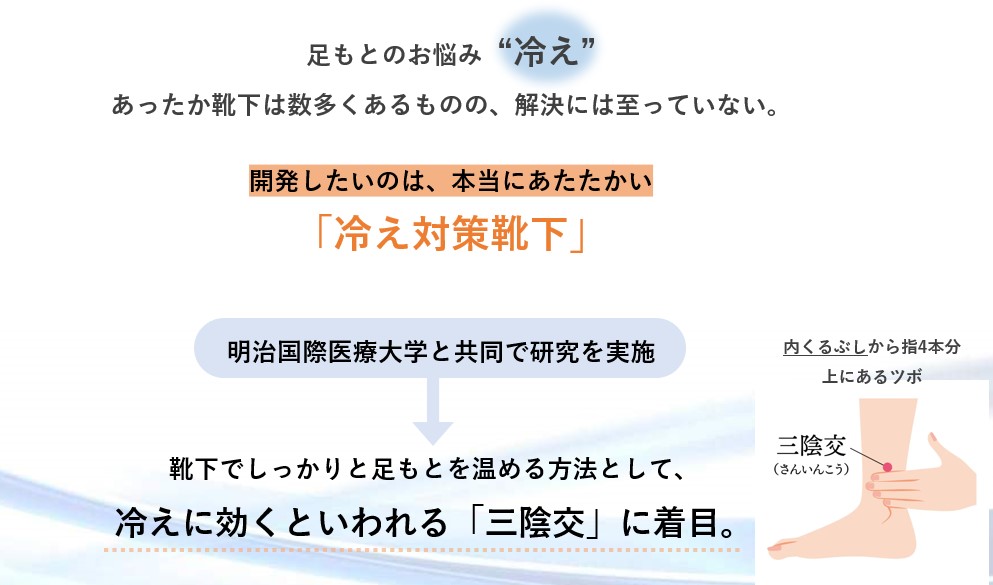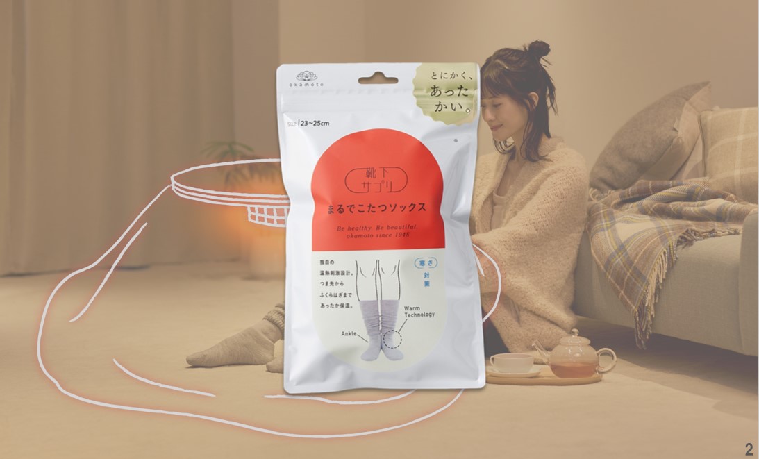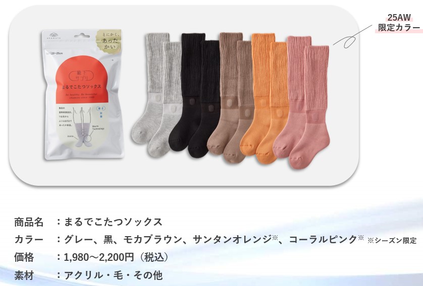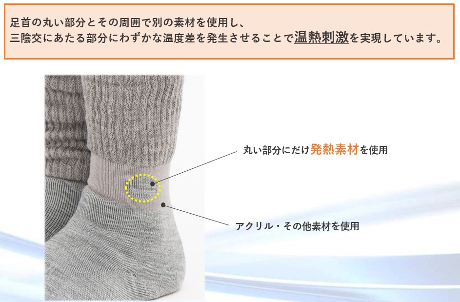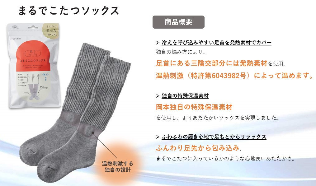 特許技術で足元からカラダを温める「まるでこたつ」シリーズのソックスタイプ。足首のツボ「三陰交」を特殊素材で温熱刺激することで、身体の内側からポカポカに。まるでこたつみたいな温かさに包まれます。
