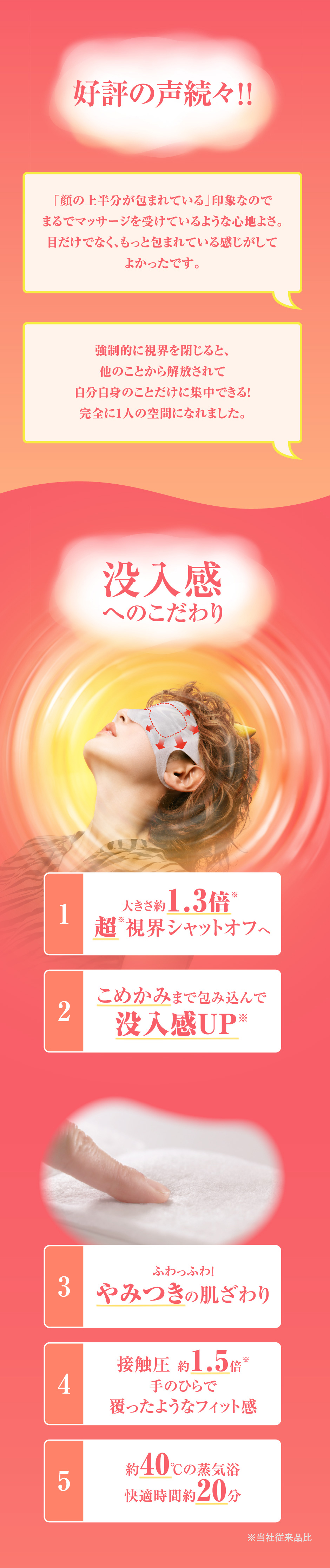 こめかみまで包み込むアイマスク 心地よさ追求設計 こめかみまで包みこんで没入感up※ 手のひらで覆ったようなフィット感 ふわふわの肌ざわり 覆う面積約1.3倍※ あったか蒸気に包まれる 深呼吸したくなるハーバルウッディの香り ※当社既存品比