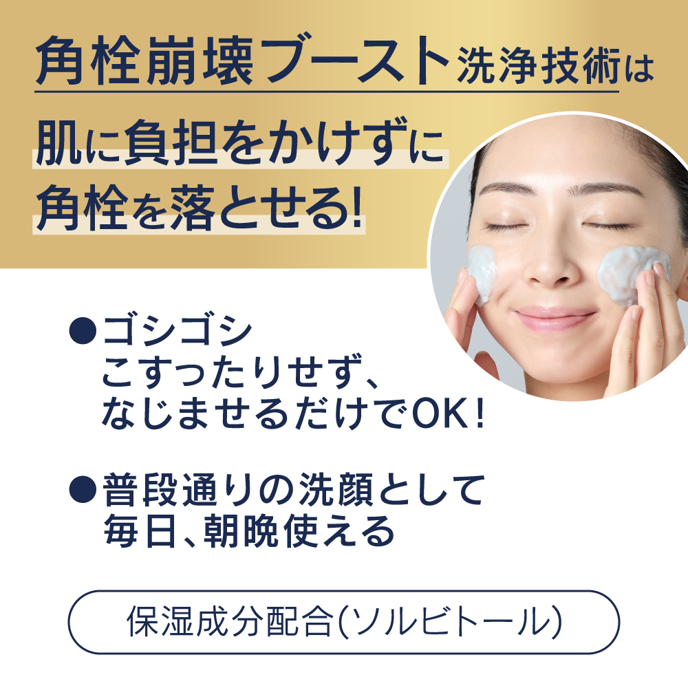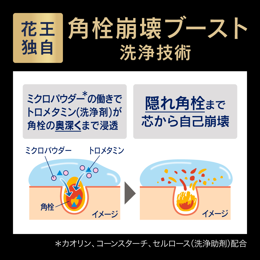 隠れ角栓まで自己崩壊!黒ずみ汚れすっきり!クリアなつるん肌に。 ●花王独自の角栓崩壊ブースト洗浄技術搭載。 ミクロパウダー(カオリン、コーンスターチ、セルロース(洗浄助剤))の働きでトロメタミン(洗浄剤)が角栓の奥深くまで浸透、隠れ角栓まで芯から自己崩壊 ●保湿成分配合(ソルビトール) ●朝使えば、化粧のりがよくなります ●なじませた後に、1分程度おくパック洗顔もOK ●気分すっきりリフレッシュアロマの香り