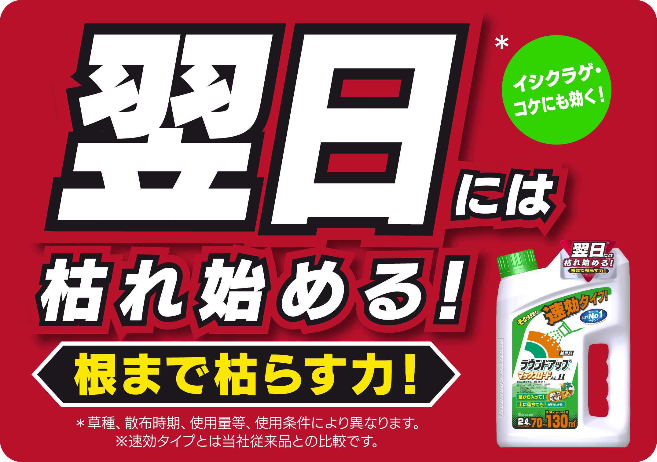 そのまま使える速効タイプ!【店頭受取可】 ※速効タイプとは当社従来品との比較です。 かけた雑草だけ 速く枯らす!! 葉から入って!根まで枯らす! 土に落ちても!自然物に分解! 広くまける ◎翌日*には枯れ始める! *雑草の種類や使用条件により異なります。 ◎安心してお使いいただけます。 ●サッと撒くだけ!かけた雑草だけ枯らす! 薬剤が葉全体にかからなくても、雑草は枯れます。 ●アミノ酸系除草剤に天然活性成分をプラス! ●スギナも枯らす! スギナ全体が濡れてしたたる程度に、たっぷり丁寧に散布する。 グリホサートカリウム塩・ペラルゴン酸カリウム塩液剤 性状:淡黄色橙明水溶性液体 家庭用