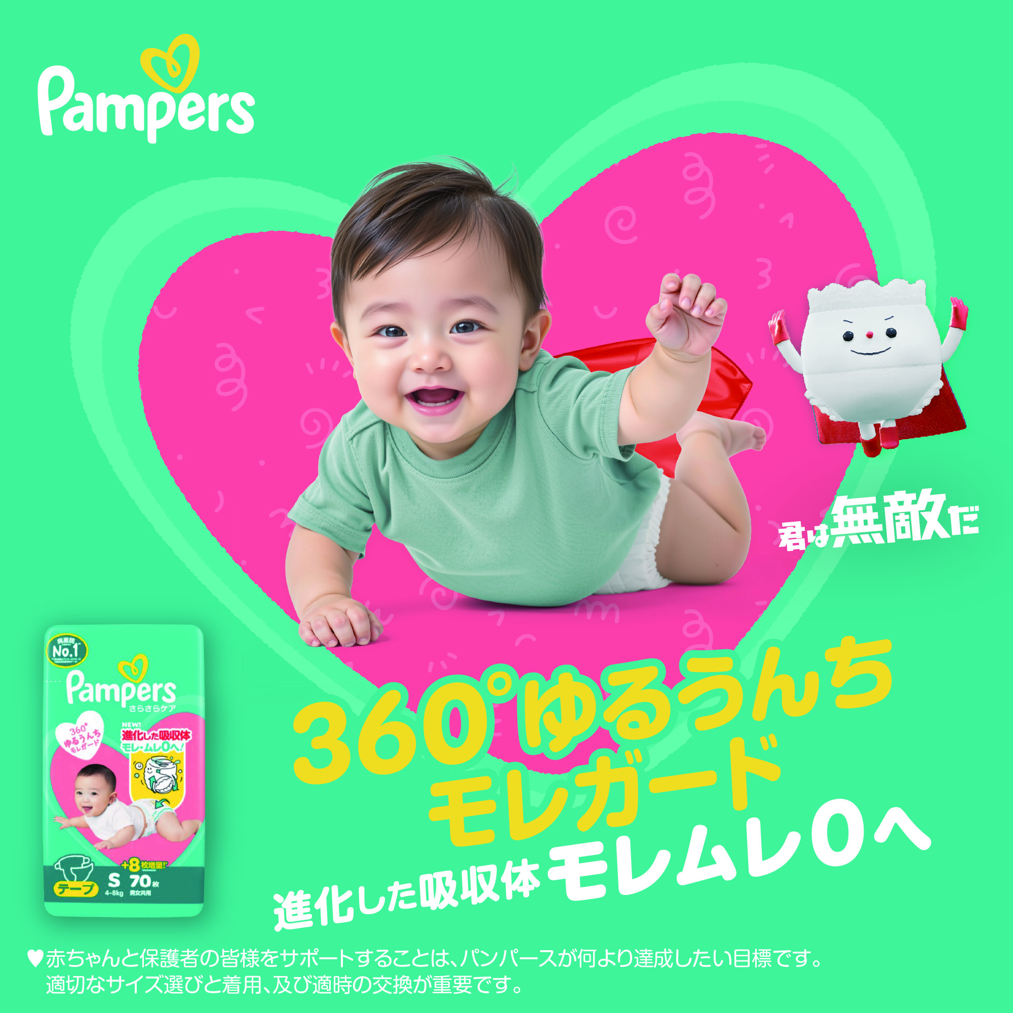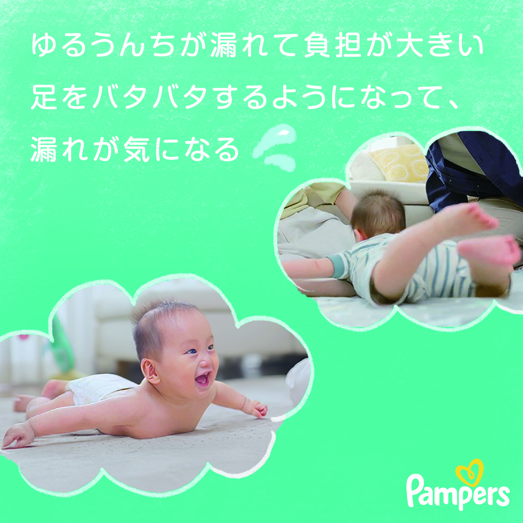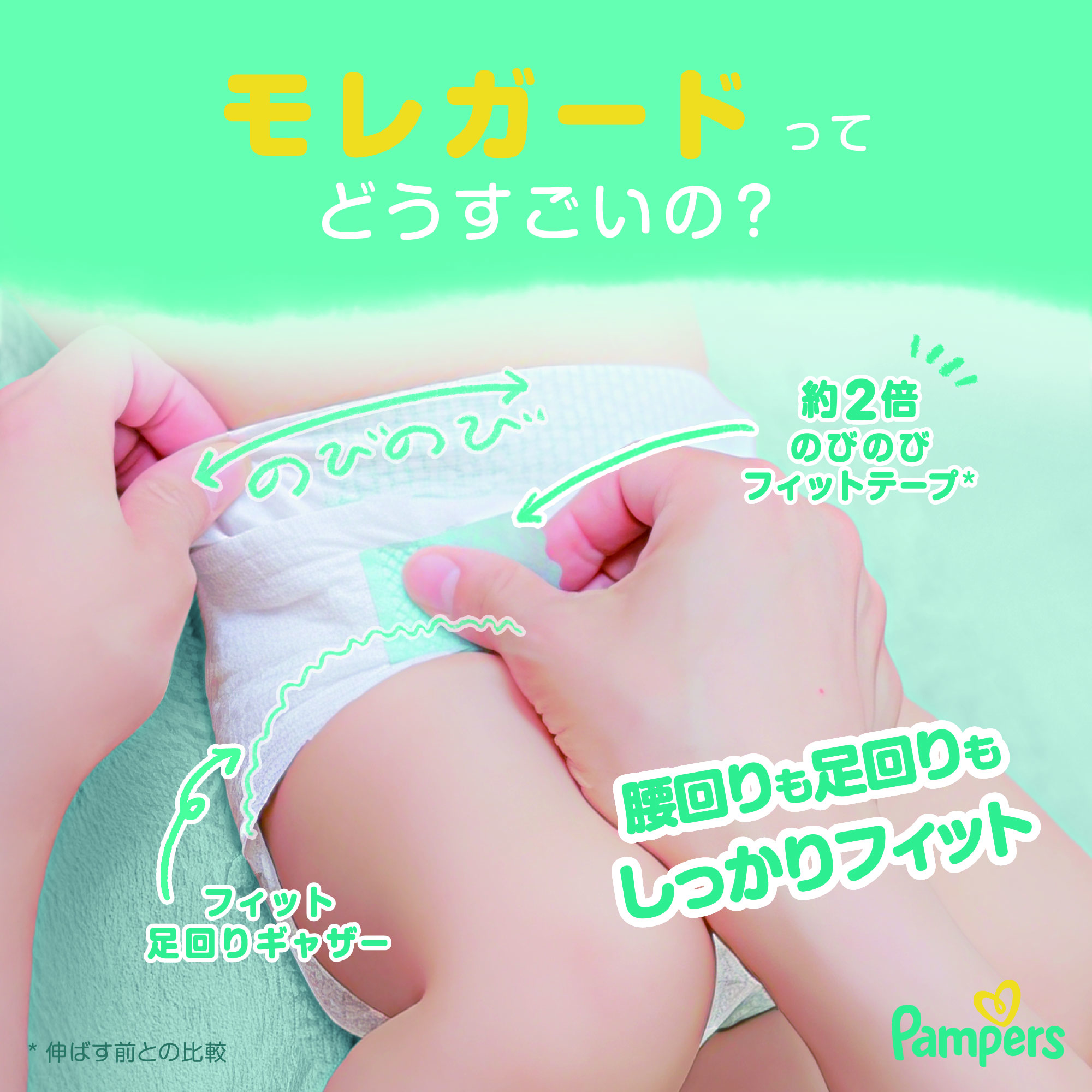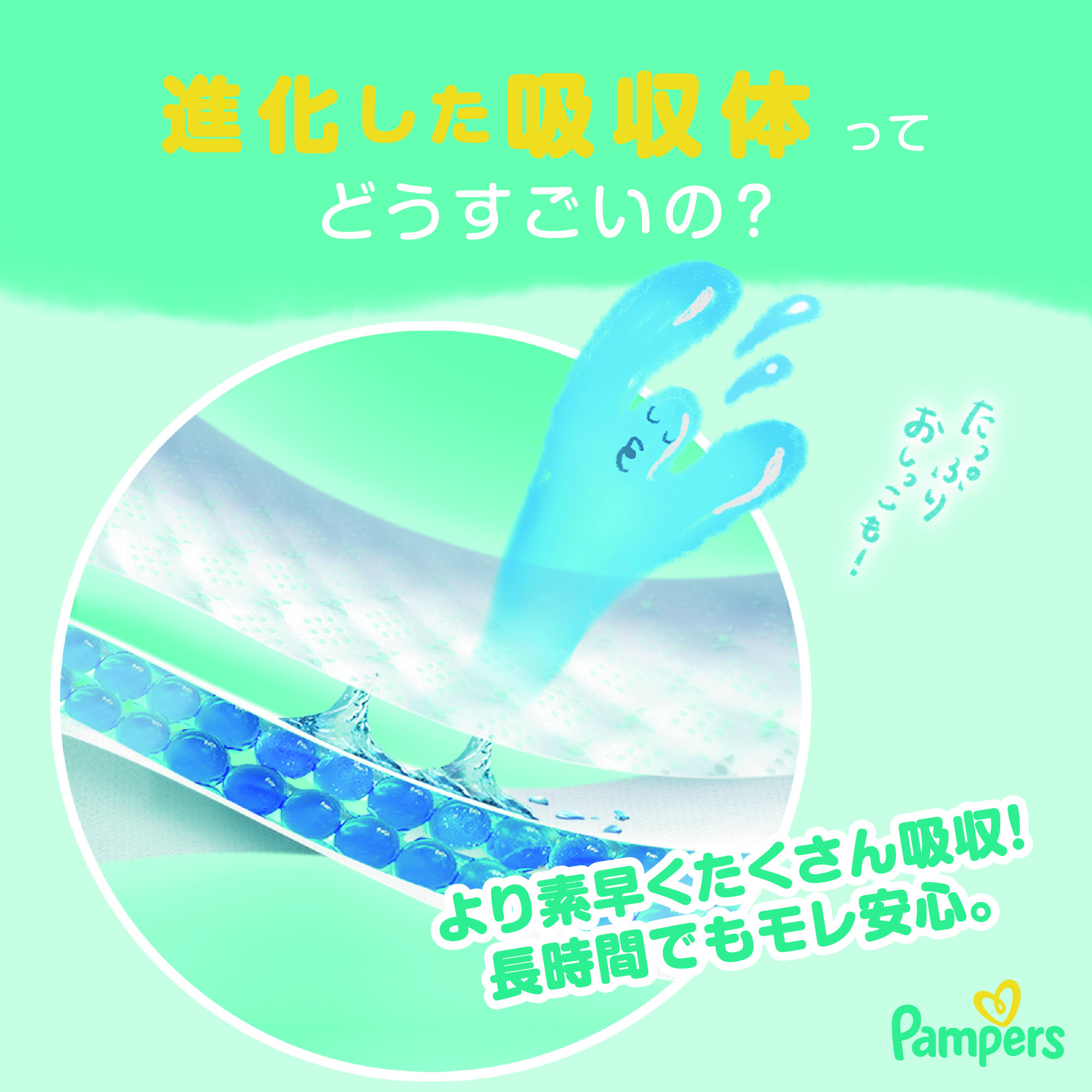 新パンパースは吸収ジェルを約120%増量*、モレの発生が半減に。素早く吸水&分散させ、赤ちゃんの肌をさらさに保ちます。*従来品との比較