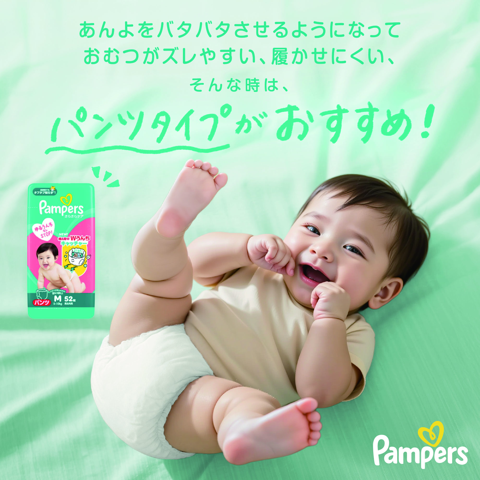 【ご使用方法】 ●サイズ替えの目安 こんな時は、そろそろひとつ大きなサイズへ。 おへそ・・・ おへそがおむつから出るようになったら。 ウエスト・・・ テープを受け部の端にとめて、おなかがきついと感じたら。 足回り・・・ サイズ調整しても、足回りに赤いアトがつくようになったら。 ●パンパースの上手なつけ方 (ご使用前に必ずお読みください。) 1 オムツを広げて、うんちガードを立てる。うんちガードがしっかり立っているか確認しながらあててください。 2 サイドの伸び縮みする部分を適度に伸ばす。サイドの部分は伸び縮みするので、ぴったりフィットする程度にのばしても赤ちゃんをしめつけすぎる心配はありません。 3 テープを受け部にとめる。テープは直接肌に当たらないように、左右対称にとめてください。 4 足回りとウエスト回りを整える。内側に折れていると、モレの原因となります。ウェスト回りは指が一本すっと入る程度が適当です。