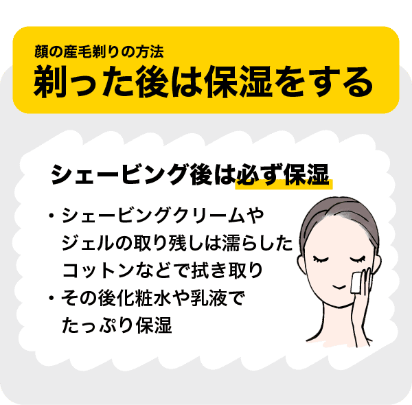シェービングの後は、必ず保湿をしましょう。シェービングクリームやジェルの取り残しがあれば、水で濡らしたコットンなどでやさしく拭き取りましょう。
