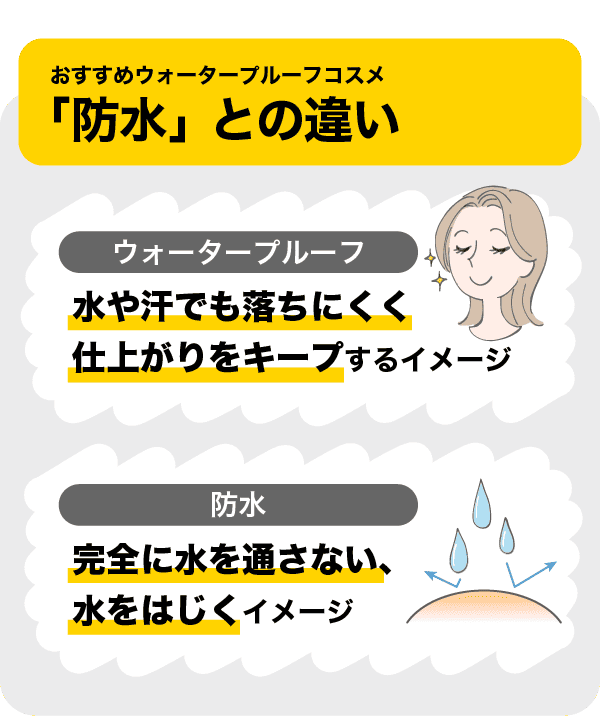 ウォータープルーフは「水や汗でも落ちにくく仕上がりをキープできる」というイメージです。「完全に水を通さない、水をはじく」というイメージの防水に対して、いわば「耐水」がウォータープルーフです。