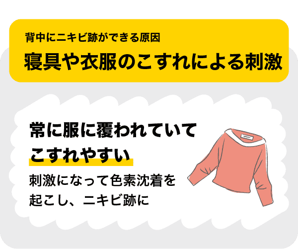 寝具や衣服のこすれも原因になります。背中は常に服に覆われていてこすれやすく、刺激になって色素沈着を起こしニキビ跡になってしまいます。