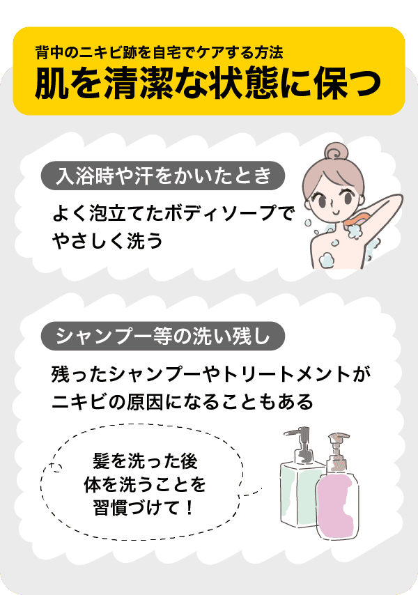 また、シャンプーやトリートメントを洗い流したときに背中に残っていると、ニキビの原因になることがあります。洗髪を終えてから体を洗う習慣をつけるようにしましょう。