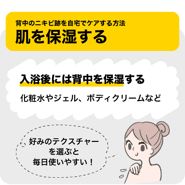 ニキビ跡のケアには保湿が重要です。入浴後には背中を保湿する習慣をつけましょう。保湿するアイテムは、化粧水やジェル、ボディクリームなど好みのテクスチャーのものを選ぶと毎日使いやすいですよ。