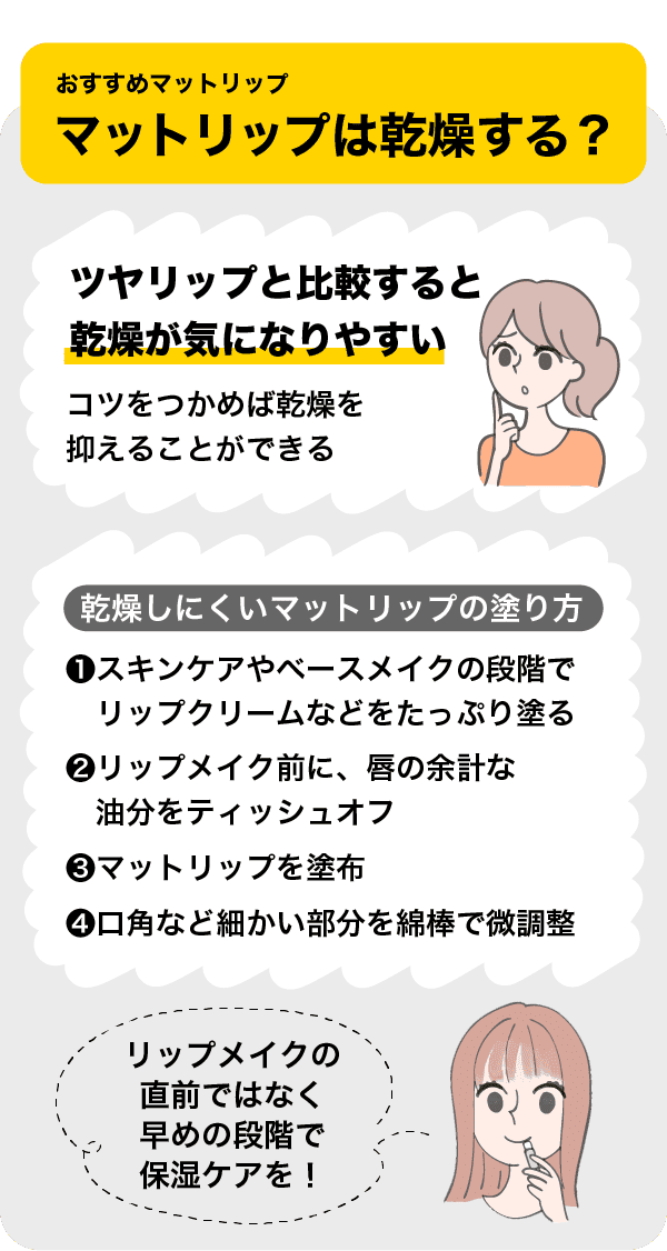 いまっぽいおしゃれな印象になれるマットリップ。でも、マットリップは乾燥しやすいイメージがあり「挑戦してみたいけれど難しそう」と感じる人も多いのではないでしょうか?