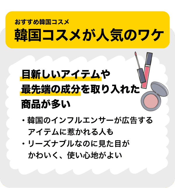 さらに、リーズナブルなのに見た目がかわいく、使い心地のよいアイテムが多いことも、韓国コスメが長く愛されている理由の1つです。