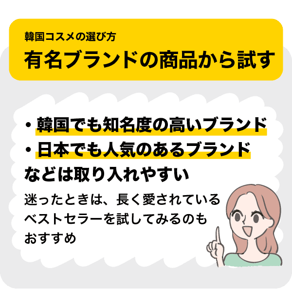 以前は、韓国の大手ブランドのみが日本で店舗を展開しているイメージがありましたが、最近では知名度にかかわらず、多くのブランドが日本向けにオフライン・オンラインストアの両方で販売を行っています。気になる商品がいくつかあって迷ったときは、韓国でも知名度の高いブランドや、日本でも人気のあるブランドを選ぶと、はじめての人でも取り入れやすいですよ。
