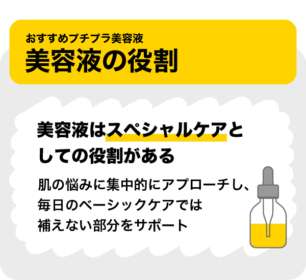 美容液には、さまざまな肌の悩みに特化した成分が含まれています。化粧水・乳液・クリームなどのベーシックなスキンケアにプラスして、美容液はスペシャルケアとしての役割があります。肌の悩みに集中的にアプローチすることで、毎日のベーシックケアでは補えない部分をサポートします。