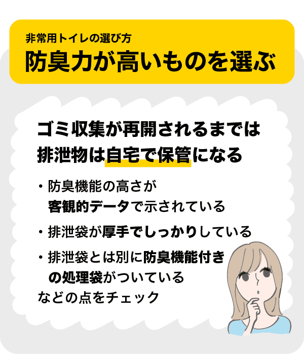 このように、一口に非常用トイレと言ってもさまざまな種類があります。備蓄品として何を買ったらよいか迷ったときには、次の3つのポイントを確認してみましょう。