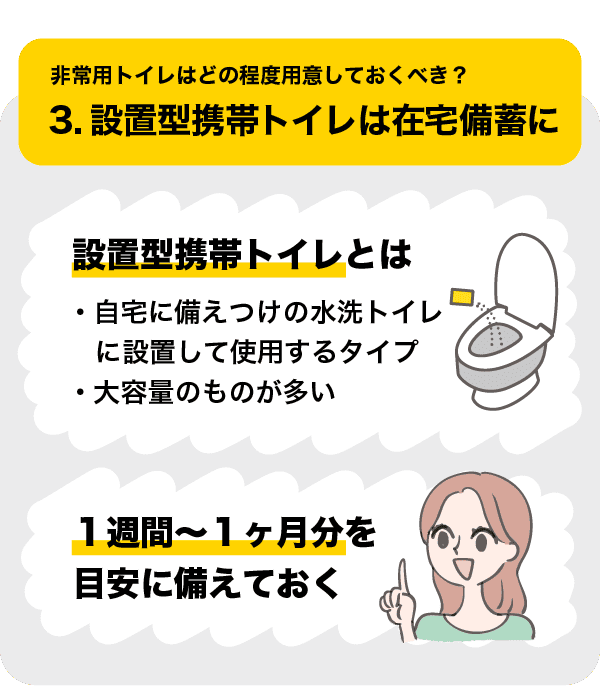 3つ目は、自宅に備えつけの水洗トイレに設置して使用するタイプの携帯トイレです。50回分、100回分などと大容量のものが多く、自宅のトイレでも使えるため在宅備蓄に向いています。1週間~1ヶ月分を目安に備えておきましょう。