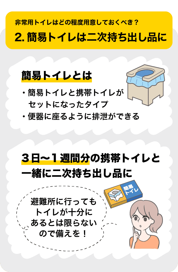 2.便器がなくても使える簡易トイレは二次持ち出し品として
