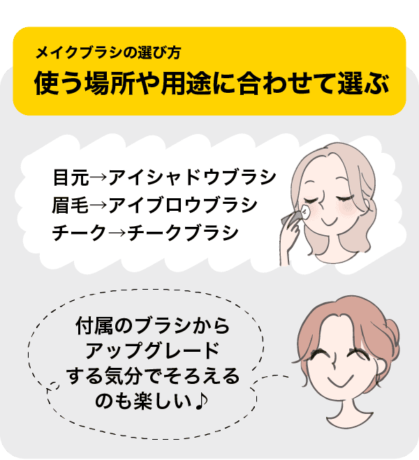 目元にはアイシャドウブラシ、眉毛にはアイブロウブラシ、チークにはチークブラシというように、使う場所や用途に合わせるのが基本的な選び方です。