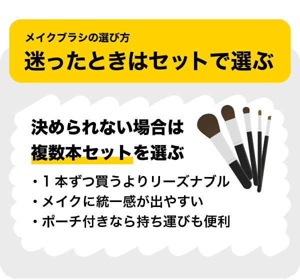 どんなメイクブラシを選べばいいか決められないなら、思いきって複数本セットになったタイプを選ぶとよいでしょう。