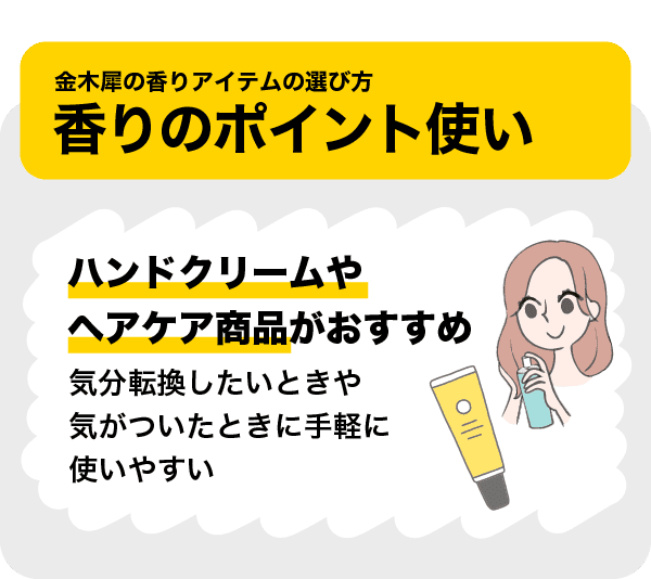 金木犀の香りをさりげなく日常使いにするなら、ハンドクリームやヘアケア商品がおすすめです。香りを楽しみながら手や髪の保湿ができます。ハンドクリームやヘアケア商品は、乾燥が気になるときだけでなく、気分転換したいときや気がついたときに手軽に使いやすいのがうれしいですね。