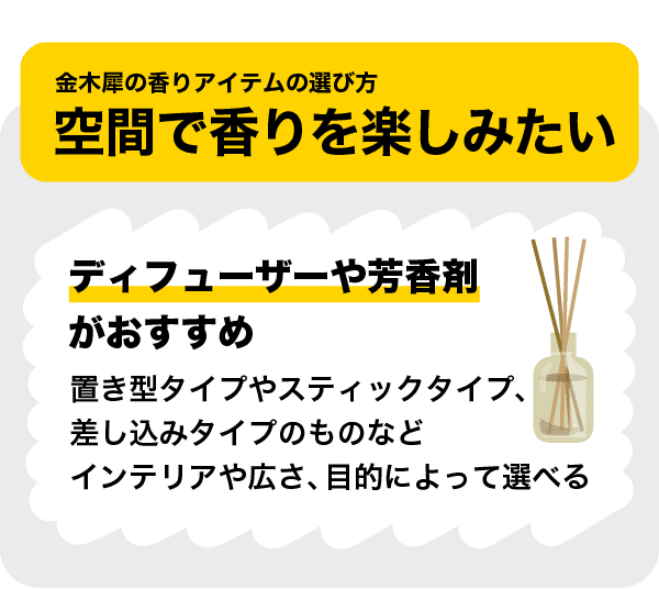 金木犀の香りを空間で楽しみたい場合は、ディフューザーや芳香剤を利用しましょう。置き型タイプやスティックタイプ、差し込みタイプのものなど、インテリアや広さ、目的によって選べるのが魅力です。