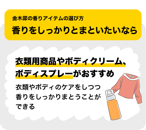 香りをしっかりとまといたいなら衣類用商品やボディクリーム、ボディスプレーを