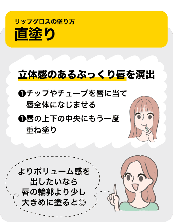 直接塗る場合は、チップやチューブをそのまま唇に当てて、唇全体になじませます。さらに、唇の上下の中央にもう一度重ね塗りをすることで、立体感を演出できます。