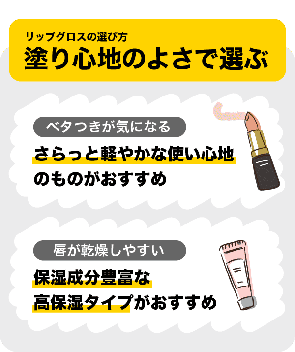 グロス特有のベタつきが気になる人は、ベタつきを感じにくいさらっと軽やかな使い心地のものがおすすめです。唇が乾燥しやすい人は、保湿成分が豊富に配合された高保湿タイプを選ぶと、うるおいを与えながらきれいなツヤを演出できます。