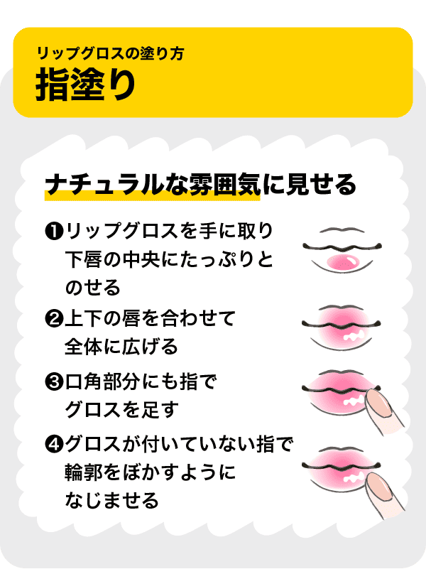 指で塗る場合は、まずリップグロスを一度手に取り、下唇の中央にたっぷりとのせます。次に、上下の唇を合わせて全体に広げ、口角部分にも指でグロスを足します。