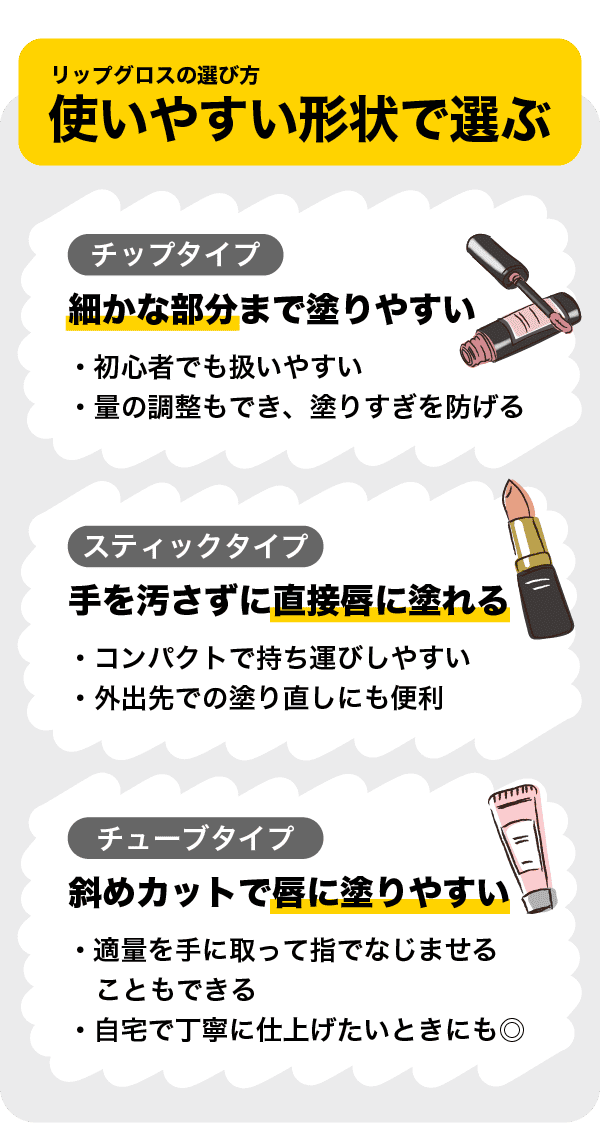 リップグロスには、チップ・チューブ・スティックなどさまざまな形状があります。「塗りやすさ」や「使用シーン」を思い浮かべながら選ぶと、自分にぴったりのタイプを見つけやすくなります。
