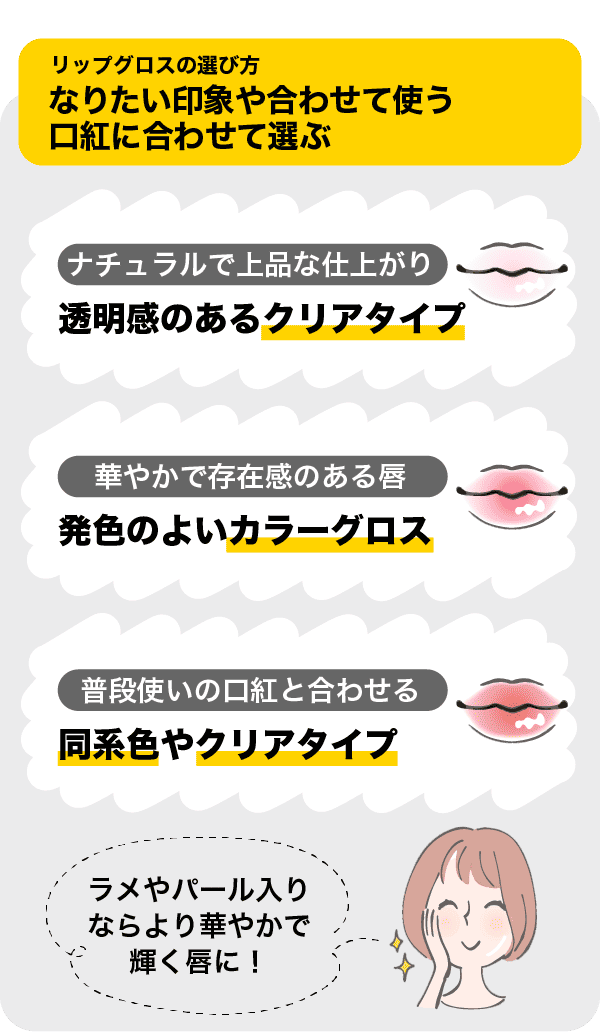 ナチュラルで上品な仕上がりなら透明感のあるクリアタイプ、華やかで存在感のある唇にしたいなら発色のよいカラーグロスがおすすめです。普段使っている口紅と組み合わせる場合は、同系色やクリアタイプを選ぶと、口紅の色味を生かしながら自然なツヤ感をプラスできます。
