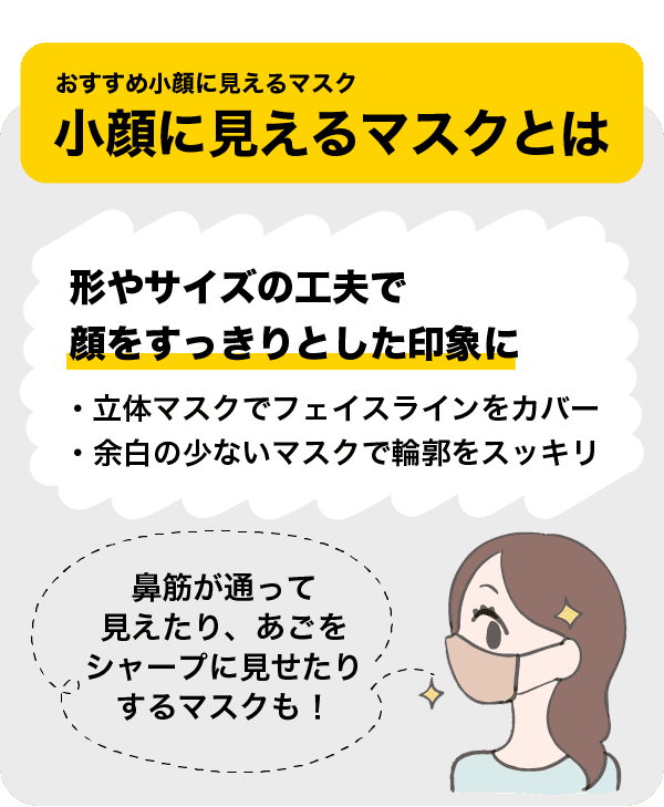 最近は面長・丸顔など、顔型に合わせた形のマスクもあるため、より小顔見せしたい人は試してみてください。