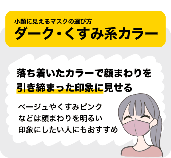 小顔見えを目指すなら、ダーク系やくすみ系カラーのマスクを選びましょう。落ち着いたカラーは、顔まわりを引き締まった印象に見せることができます。