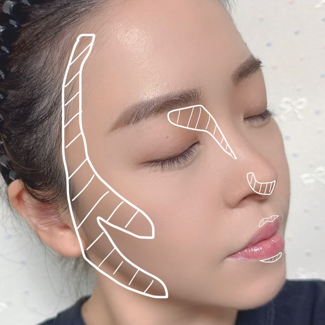 シェーディングカラーを使い、フェイスライン、鼻の付け根や小鼻の周り、唇の山と下部分など、顔の各パーツに陰影を加えていきます。特に頬は丸みを強調するのではなく、骨格が際立つように、頬骨に沿ってチークのようにシェーディングを入れるのがポイントです。