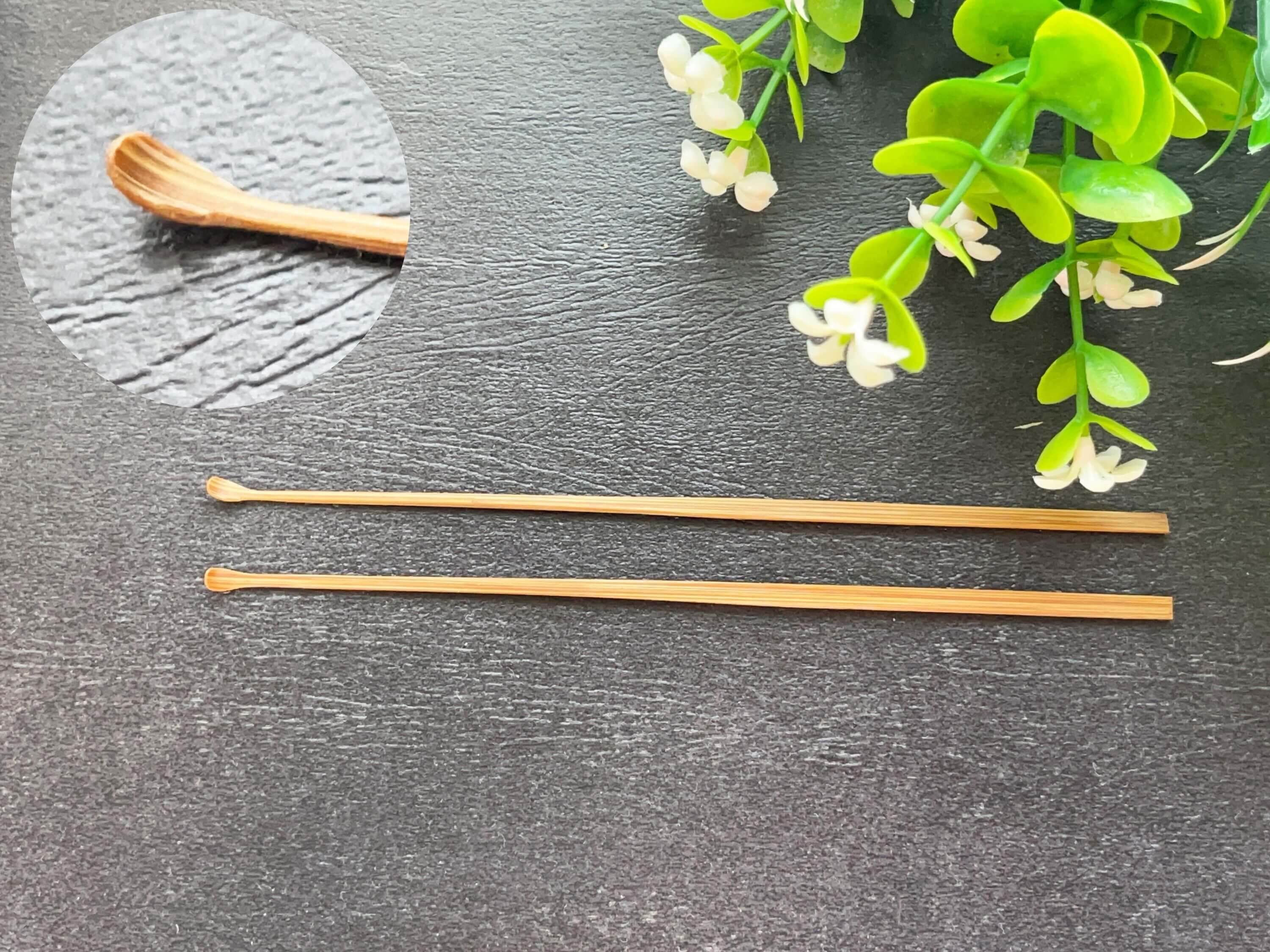 竹製の長短2本セットになった、大人用サイズの耳かきです。耳掃除をする箇所に合わせて使い分けができます。短い耳かきは耳の入り口付近の掃除に、長い方は耳の中の耳垢を掻き出すのに適しています。
