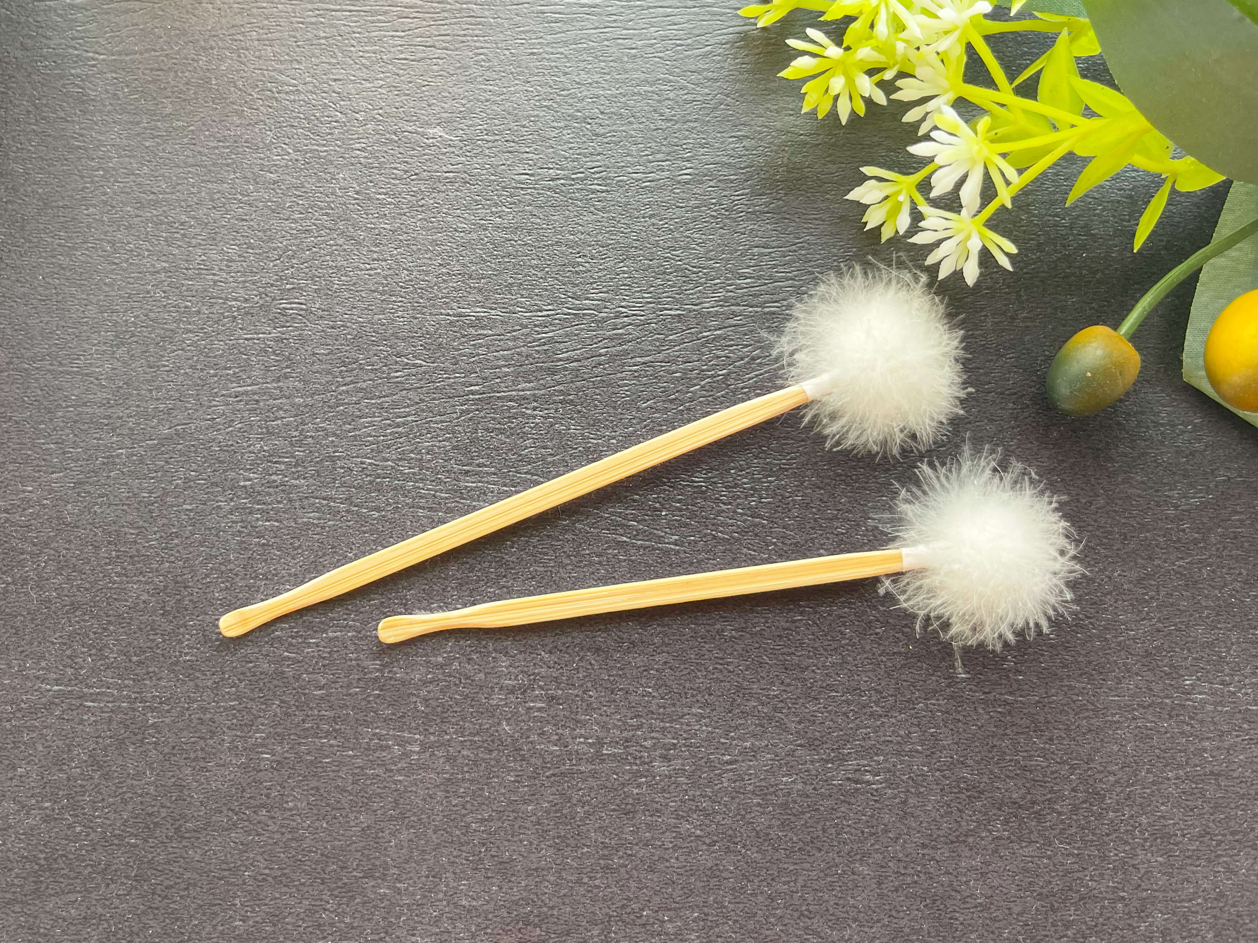 昔ながらの竹製の梵天つき耳かきです。長短2本がセットになっているため、使用する箇所や持ちやすさに合わせて選べます。梵天は、すくい残した粉末状の耳垢を払い落とすのに便利です。