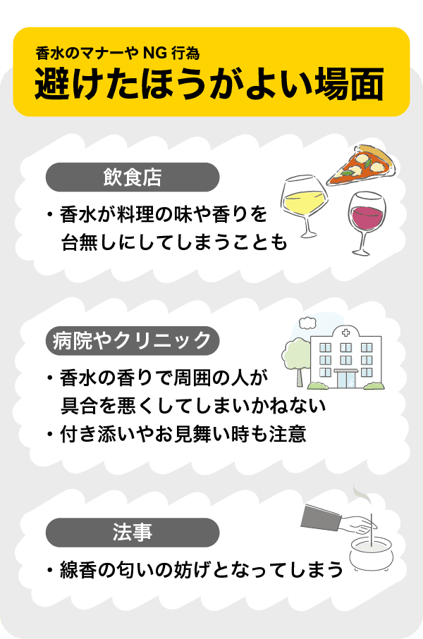 体調の悪い人が多くいる病院やクリニックでは、香水の香りでかえって具合が悪くなってしまいかねません。香りがじゃまになって病気の発見や治療の妨げにならないよう、医療機関に訪れる際はつけないようにしましょう。つき添いやお見舞いに行く際も同様です。