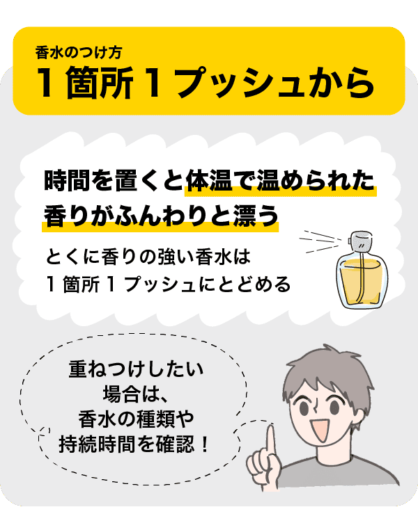 香水は1箇所1プッシュが基本です。最初は物足りなく感じるかもしれませんが、時間を置くと体温で温められた香りがふんわりと漂ってきます。とくに、香りの強い香水は1箇所1プッシュにとどめましょう。重ねつけしたい場合は、香水の種類や持続時間を確認しましょう。
