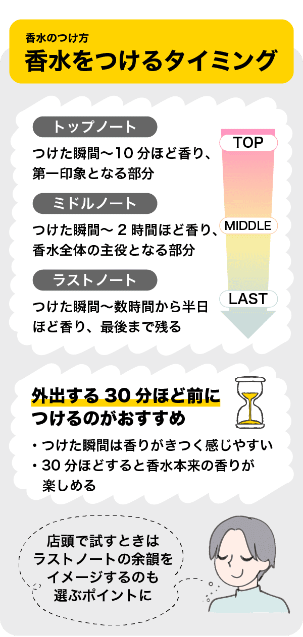 なお、店頭で香水を試すときには、瞬時の香りだけでなくラストノートの余韻をイメージするのも選ぶポイントとなります。