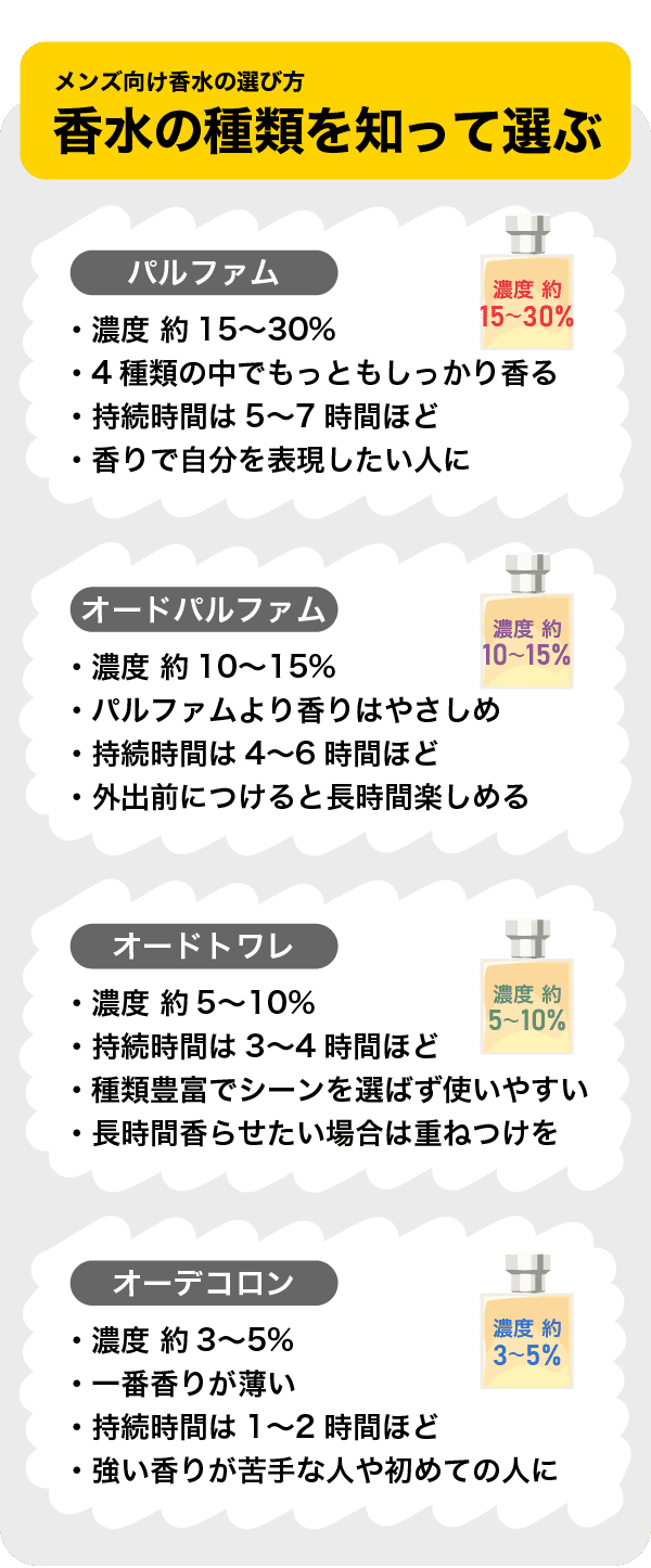メンズ向け香水として販売されているのは、おもにオードパルファム、オードトワレ、オーデコロンの3種類です。パルファムはレディース向け香水に多く見られ、メンズ向け香水としての日本での取り扱いは少ないと言えます。