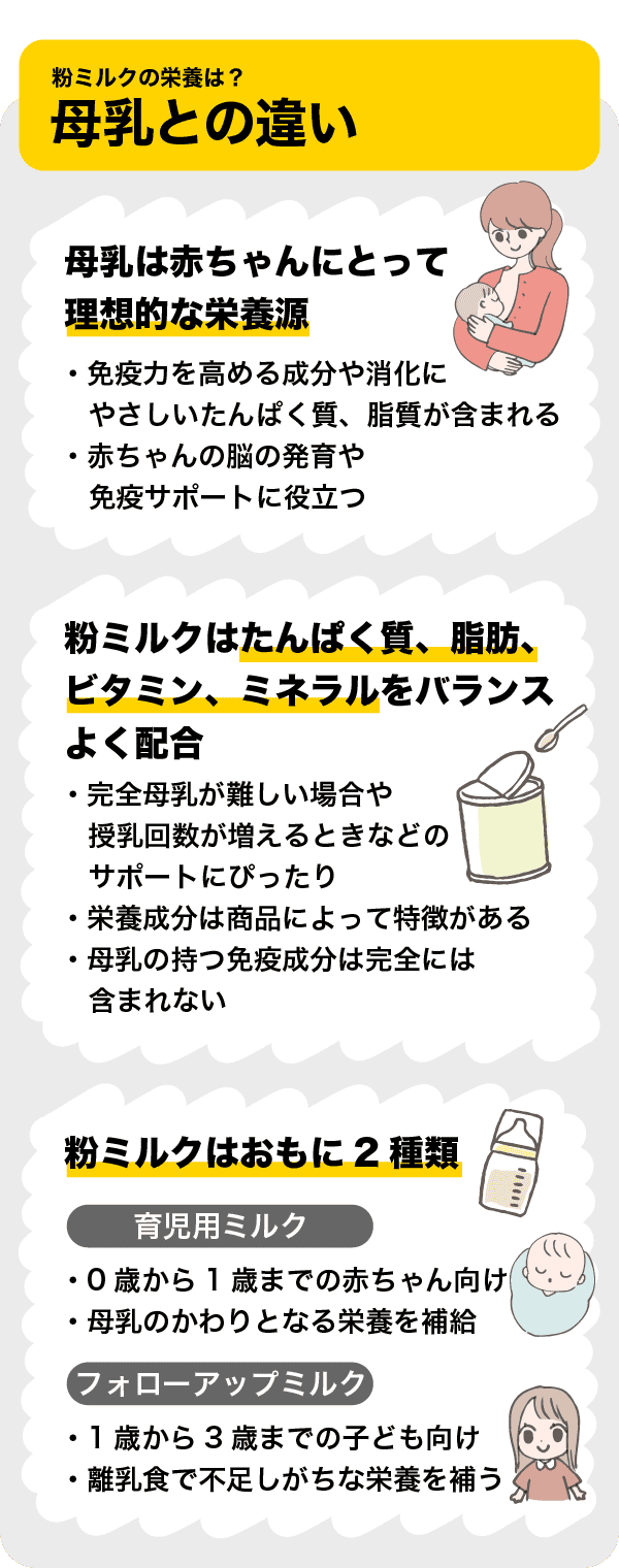 しかし、粉ミルクには母乳の持つ免疫成分は完全には含まれないため、その点を理解して使うことが大切です。