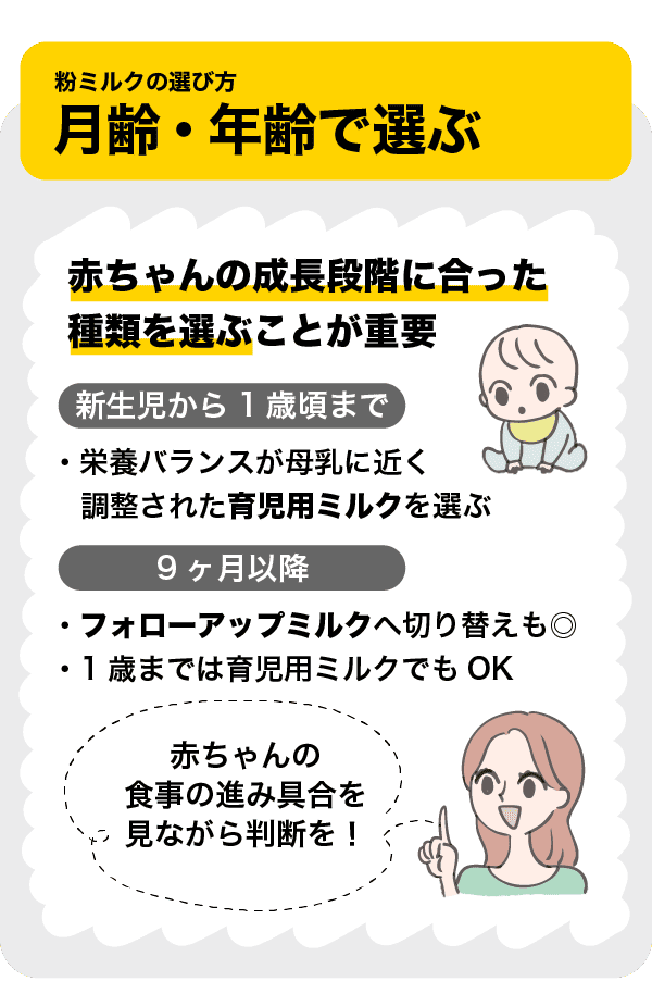 粉ミルク選びでもっとも重要なのは、赤ちゃんの成長段階に合った種類を選ぶことです。