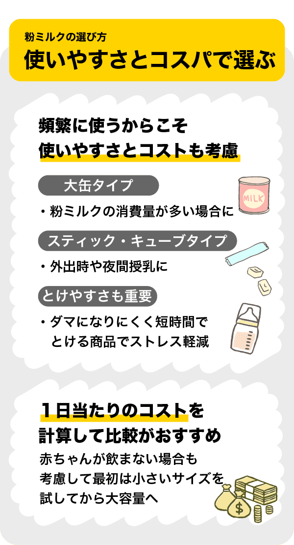 価格面では、1日当たりのコストを計算して比較することをおすすめします。箱での価格が安いからといって赤ちゃんが飲んでくれなければ意味がありません。まずは、小さいサイズで試してから大容量を購入するようにしましょう。